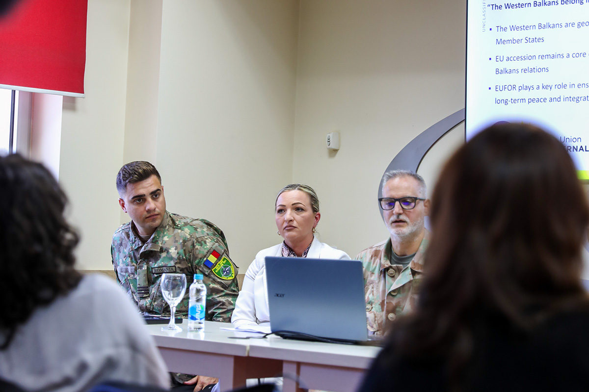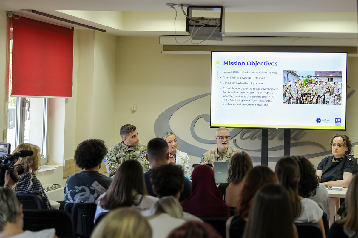 Učesnici su imali dinamičan razgovor s timom za strateške komunikacije EUFOR-a, iskoristili priliku da postave mnoga pitanja i lično diskutuju o prezentaciji na kraju događaja.